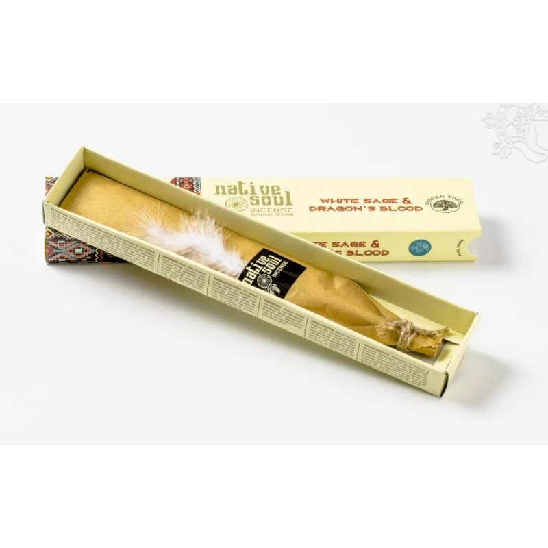 Bețișoarele parfumate White Sage & Dragon's Blood, din colecția Native Soul, de la Green Tree, se remarcă prin aromele lemnoase și de tămâie, specifice salviei albe și rășinii sânge de dragon, pentru purificare și protecție energetică.
