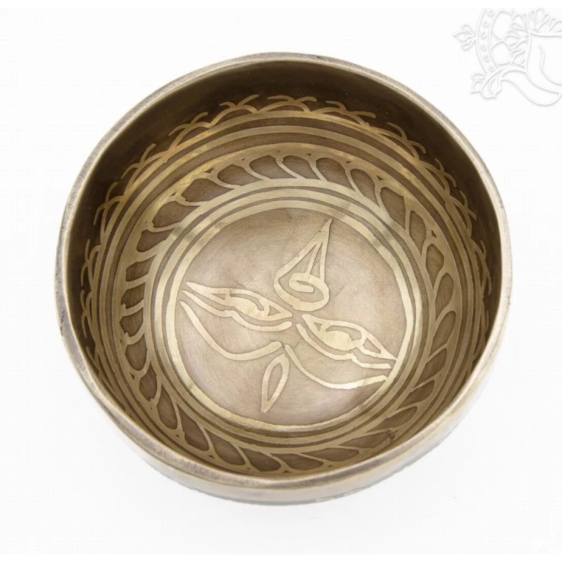 Bol tibetan, fabricat manual, din 7 metale, cu mantra, 237 de grame, are un diametru la gura de 9,5 cm și o înălțime de 5 cm.